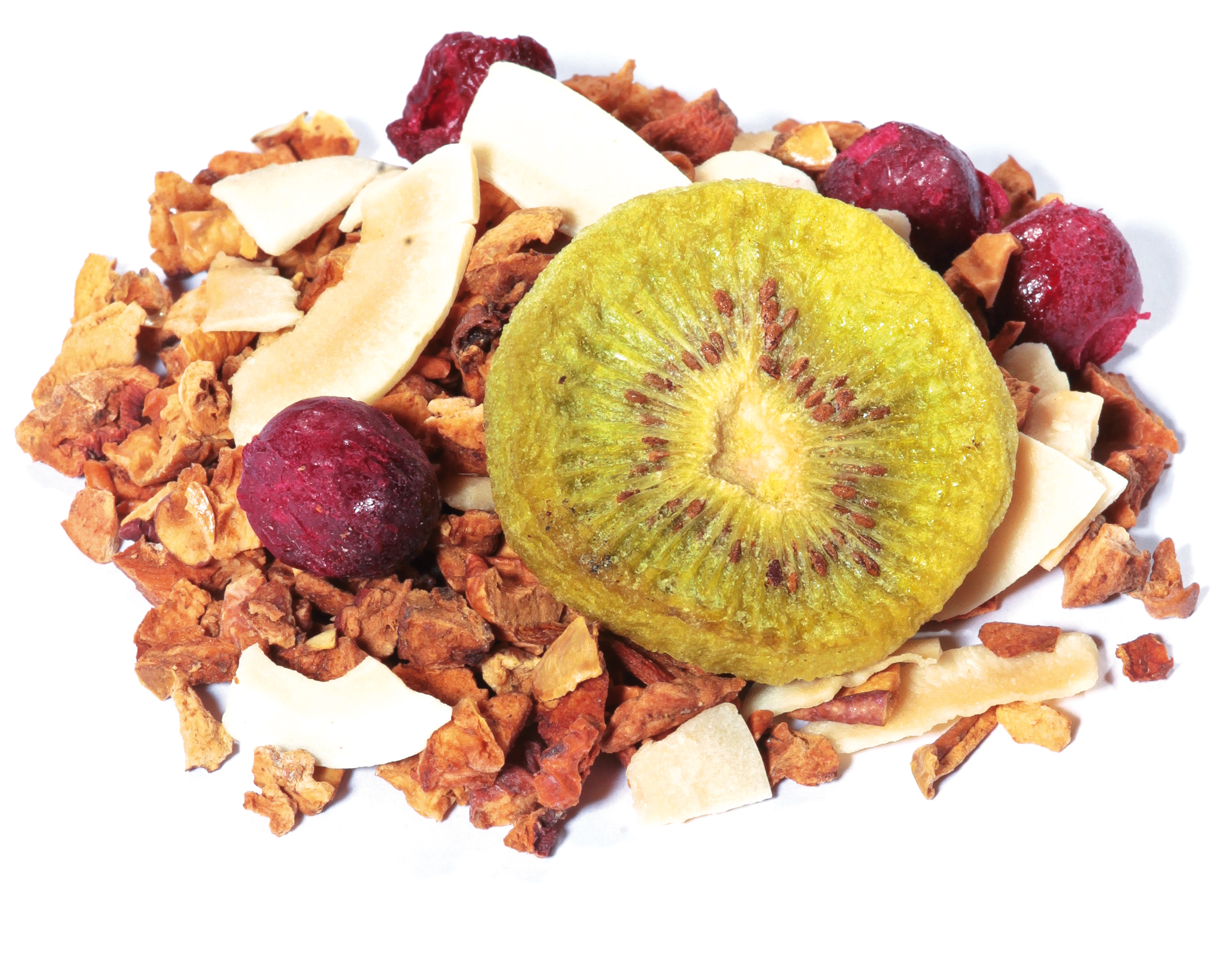 Pomme, coco (coco, graisse de coco, sucre), arôme, tranches de kiwi, cerise, canneberges.